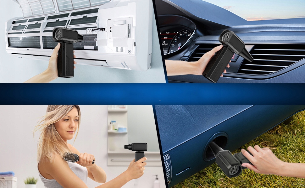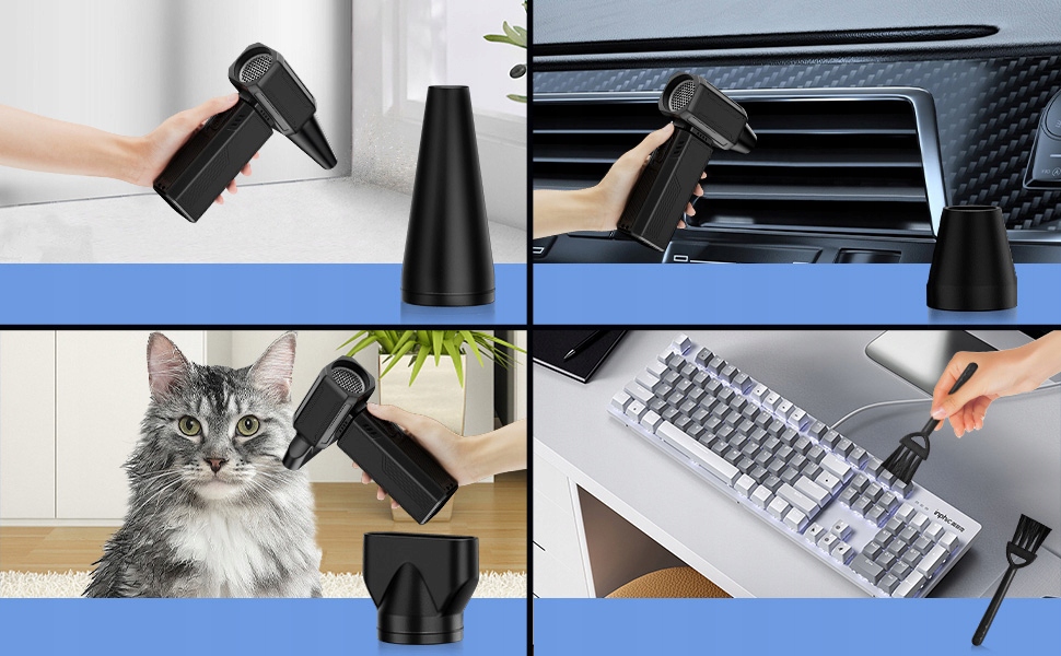 Набор очистителя электрического воздуха содержит три различных типа форсунок и кистей, которые могут быть заменены подходящими соплами для очистки различных устройств. Многофункциональный чистящий агент, подходящий для очистки компьютеров и клавиатур, электронных продуктов, оконных решетков, диванов, автомобилей, волос животных, надувных сидений и т. Д.