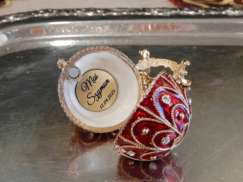 Я приглашаю вас купить чрезвычайно красивый предмет. Декоративное яйцо на раме, очень богато украшенное подражаниями алмазов по всей поверхности и на основе. Субъект стилизован как знаменитые яйца Faberge, произведенные в российский двор. Настоящие маленькие чудеса.