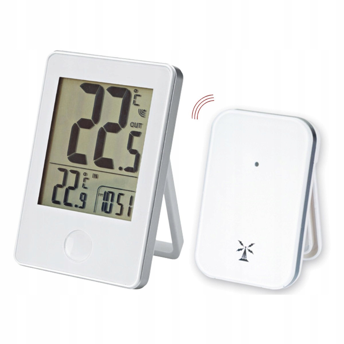 Беспроводной электронный термометр изготовлен из высококачественного белого пластика. Передняя панель базовой станции и передатчика имитирует стеклянную панель, которая дает устройство современности и элегантности. Термометр оснащен большим, очень читаемым, жидкокристаллическим дисплеем с высоким уровнем высокого уровня, что позволяет легко прочитать информацию, отображаемую на нем. Измерение температуры использует два датчика. Внутренняя температура измеряется датчиком, расположенным внутри базовой единицы, внешняя температура измеряется датчиком, помещенным в беспроводной передатчик. Базовый блок и передатчик можно установить (повесить) на стене благодаря монтажным отверстиям, расположенным на задней панелях или расположены на плоской поверхности, используя складные ножки.