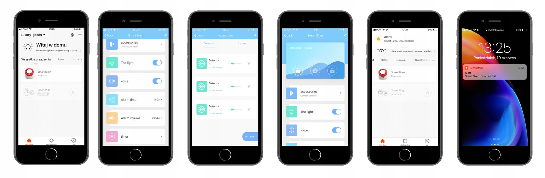 При активации сирена издает очень громкий звук вместе со светодиодной сигнализацией и отправляет уведомления через WIFI на смартфон.