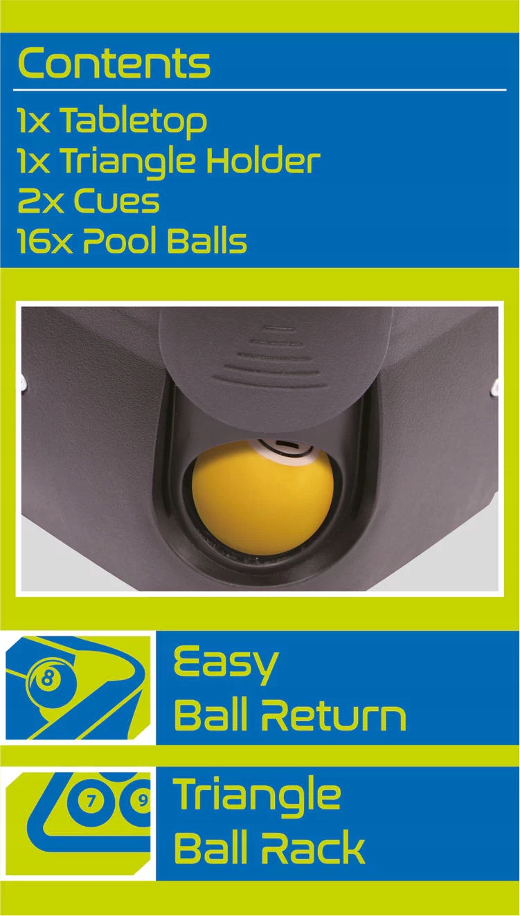 • в комплекте: бильярдный стол, два кия, 16 шаров, треугольник для укладки, нескользящие ножки