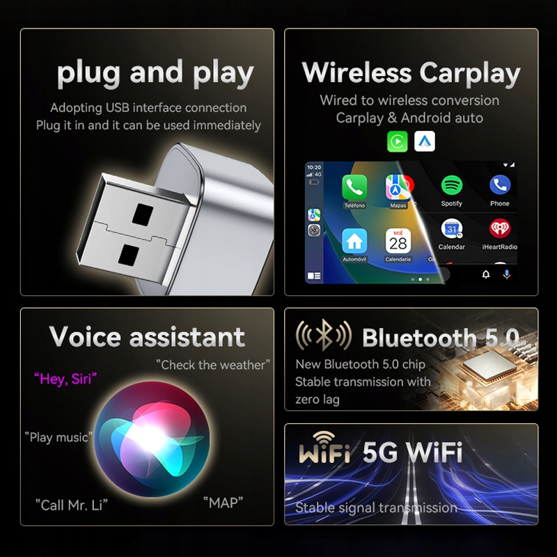 Carplay Android Беспроводная коробка, нарушает ограничения традиционных проводных соединений, инициируя новую эру беспроводного подключения в автомобиле с усовершенствованными Bluetooth и Wi -Fi -технологиями