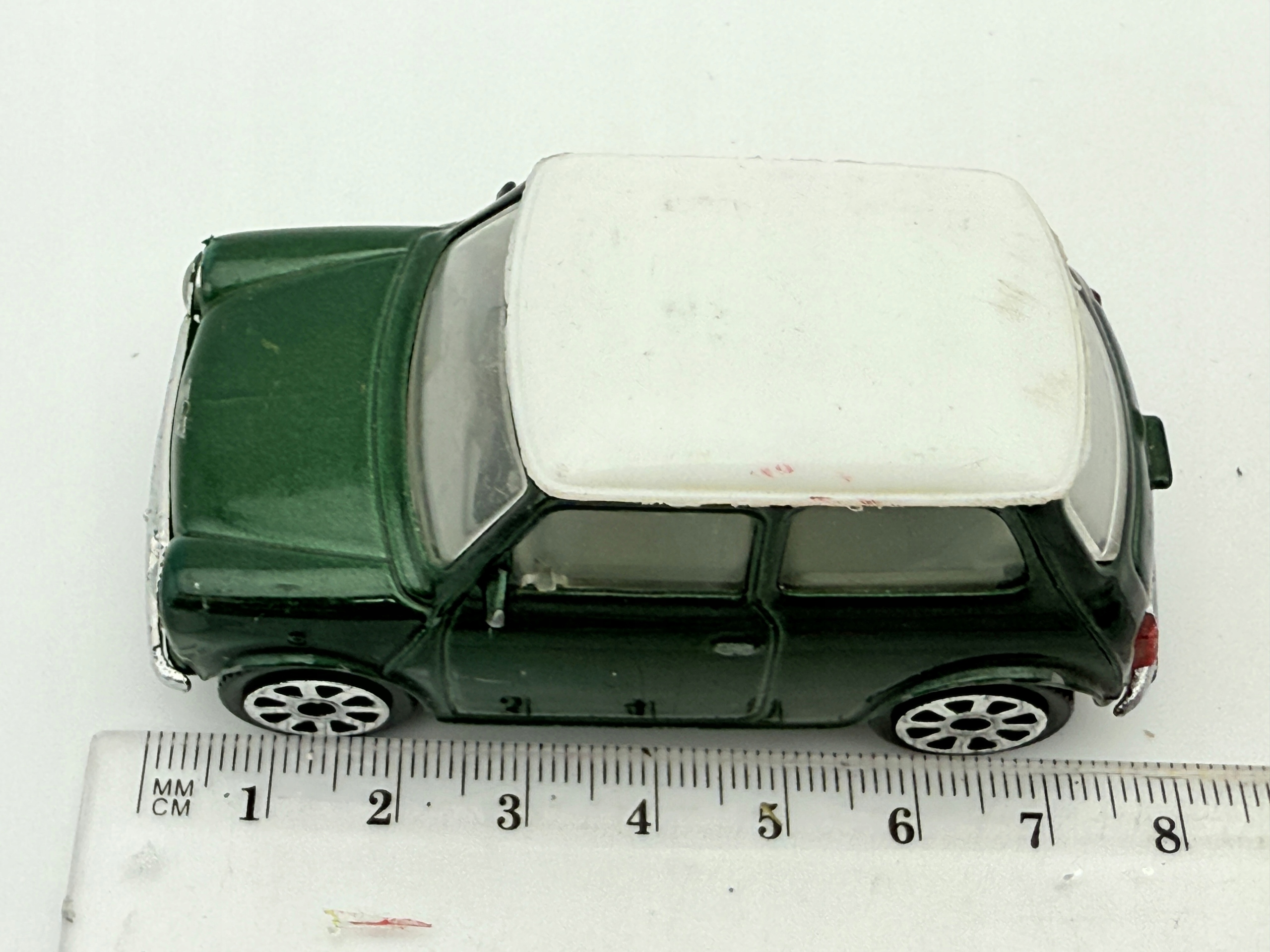 Рессорный MINI COOPER отличается элегантным зеленым окрасом и контрастной белой крышей. Он изготовлен из металла и пластика, что делает его прочным и привлекательным. Такие детали, как алюминиевые диски и тщательно воспроизведенные элементы кузова, привлекают внимание коллекционеров. Длина модели 60 мм, что делает ее идеальной для коллекций. Несмотря на незначительные следы использования, общее состояние очень хорошее, что делает его интересным для любителей миниатюрной техники.