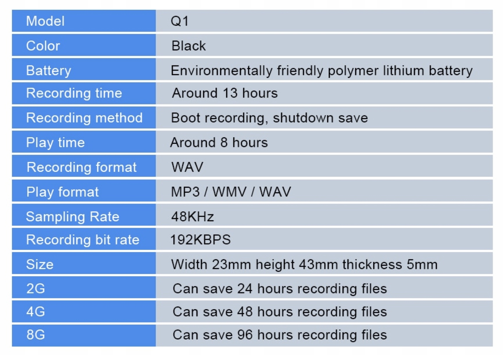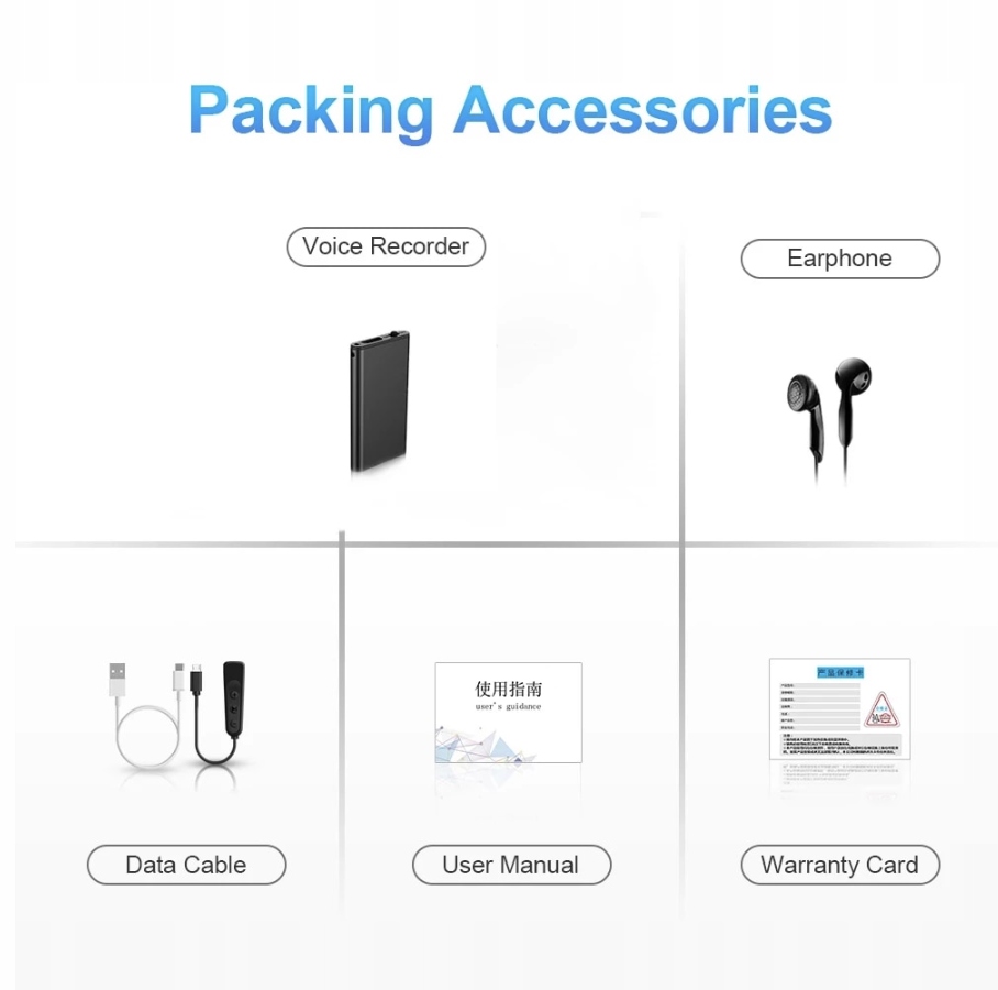 <р>1. Металлический корпус, мини-фюзеляж, прочный и изысканный. <р>2. Начинайте запись при включении питания, сохраняйте запись при выключении питания, простота в эксплуатации. <р>3. Запись, активируемая голосом: запись автоматически начинается при обнаружении звука и приостанавливается, когда звук отсутствует. <р>4. Поддерживает воспроизведение музыки в формате MP3WAV/WMA, интересно и осуществимо. <р>5. Имя файла записи соответствует времени записи и поддерживает шифрование файлов.Простота в использовании