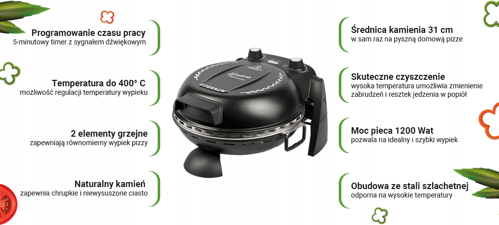 • Warms за несколько минут до 400 °C, что позволит приготовить пиццу всего за 4 минуты!