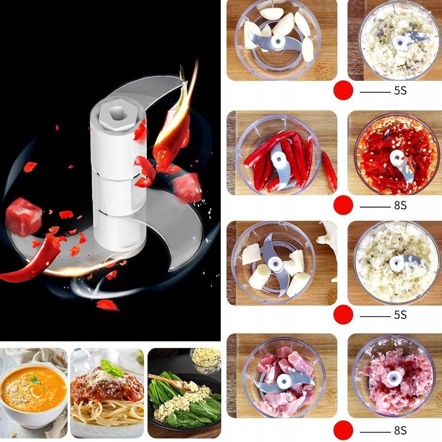 Идеально подходит для измельчения чеснока, имбиря, перца, моркови, овощей, лука, фарша и других ингредиентов. Перед использованием рекомендуется разрезать большие куски на более мелкие и очистить более твердые овощи/фрукты.