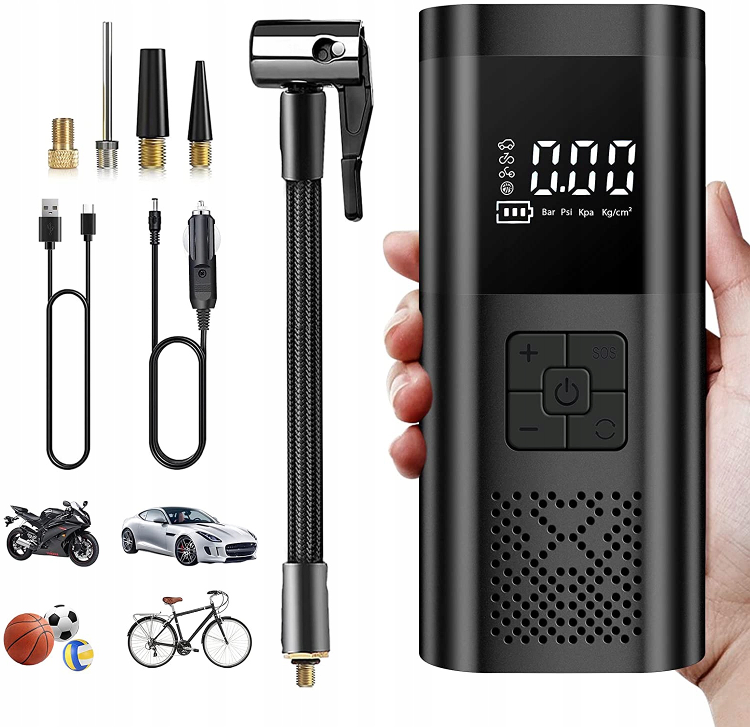 Многофункциональный воздушный насос: в комплект поставки воздушного компрессора входят 4 адаптера для накачивания автомобильных шин/ мотоциклы/велосипеды, круги для плавания, каяки, футбольные мячи, баскетбольные мячи, детские бассейны, спальные мешки, палатки и многое другое. Аккумуляторный компрессор небольшой, легкий и эргономичный, подходит в качестве аварийного оборудования для прогулок, путешествий, езды на велосипеде, кемпинга и т. д.