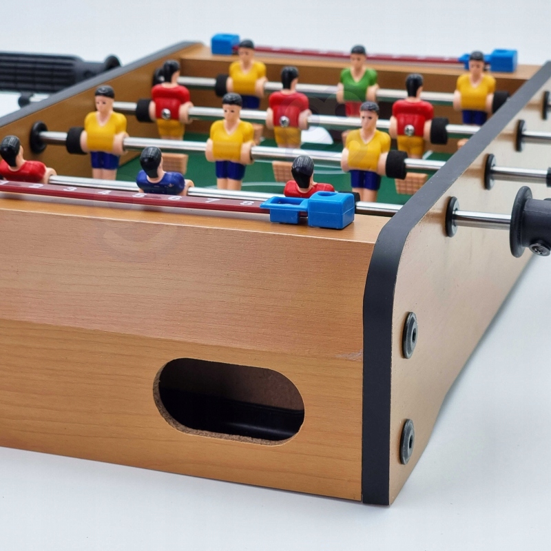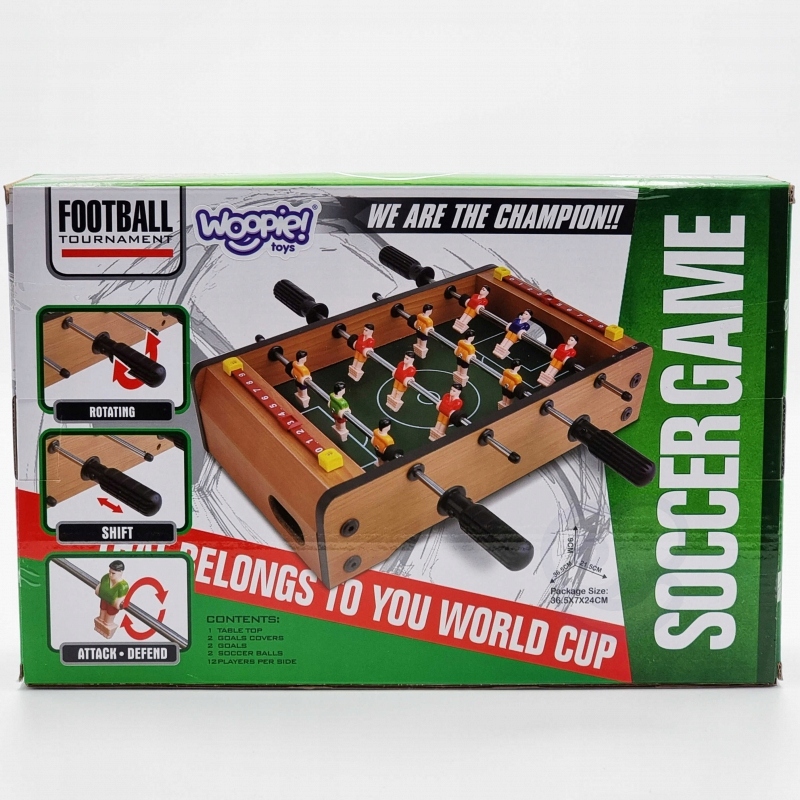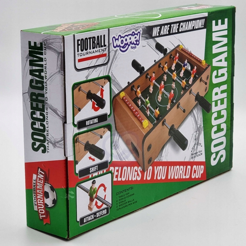 - Настольный футбол Woopie займет вашего малыша на долгие часы. Игра предназначена для двух человек. У нас в составе каждого гида по три игрока, которые смело играют на поле. Все упаковано в очень красивую и аккуратную упаковку. Удобная ручка позволяет удобно переносить коробку с содержимым.