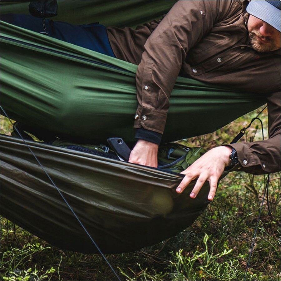 HUBA изготовлена из водонепроницаемой ткани рипстоп — той же ткани, которую мы используем для пошива брезента. Он не впитывает и не пропускает влагу, поэтому помещенный в него багаж всегда будет в безопасности. Он не промокнет, не испачкается и не замерзнет. Поскольку HUBA – это мини-гамак, помещенный в него багаж не останется валяться на земле, не скатится по склону, не упадет случайно под ноги, а мелкие предметы не упадут в заросли высокой травы – ведь багаж надежно висит под основным гамаком!