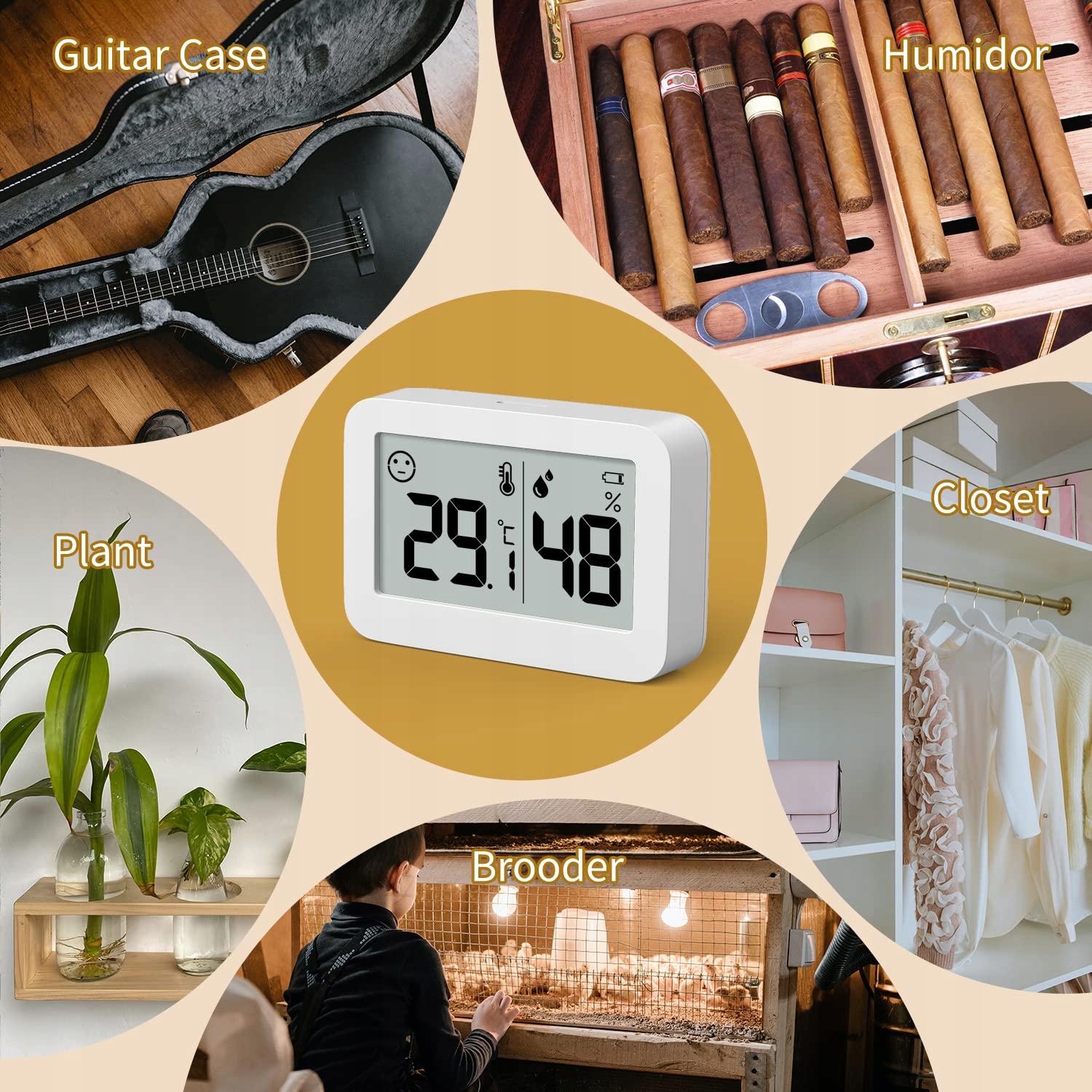 Простота установки — мини-цифровой измеритель влажности с двусторонними подушечками 3M, можно прикрепить или разместить где угодно, например, в инкубаторе, прилавке, детской комнате, кухне, офисе, теплице, комнате для гитары, офисе, саду и подвале. ли>