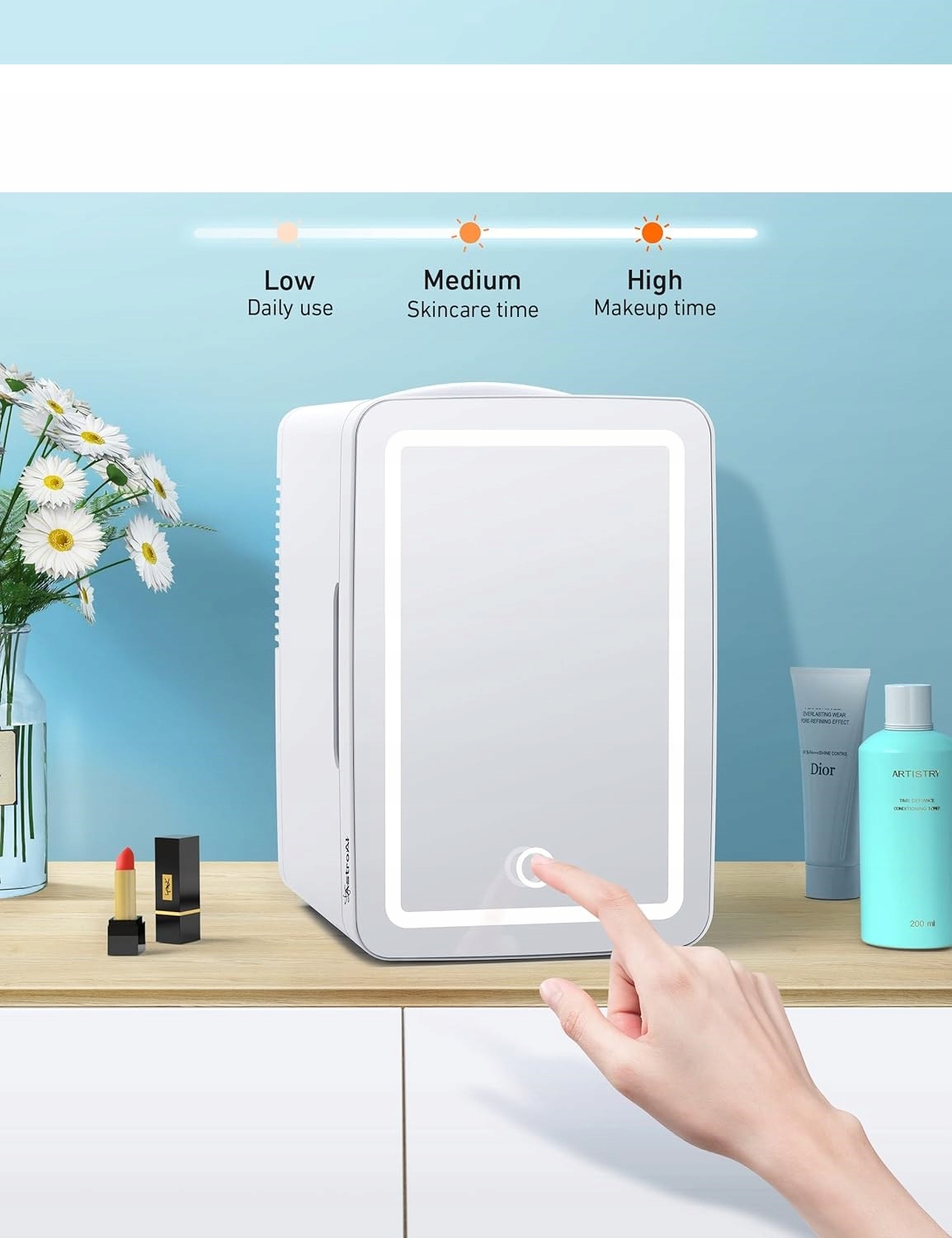 - Стильное зеркало: холодильник оснащен зеркалом и светодиодной подсветкой. Благодаря регулируемой светодиодной подсветке вы можете наносить макияж в темноте. Совет: Аккуратно нажмите кнопку светодиода, чтобы включить или выключить его. Нажмите и удерживайте кнопку, чтобы настроить интенсивность света.