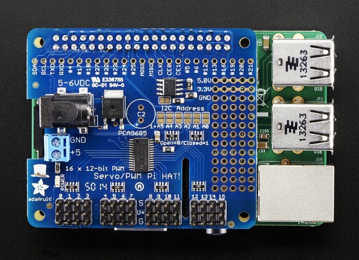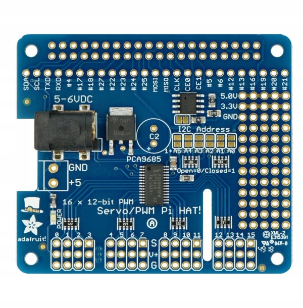 Оверлей для Raspberry Pi, позволяющий управлять 16 сервомеханизмами. Система генерирует ШИМ-сигнал частотой до 1,6 кГц с точностью до 12 бит. Плата адаптирована к разъемам Raspberry Pi A+, B+ и 2 B.