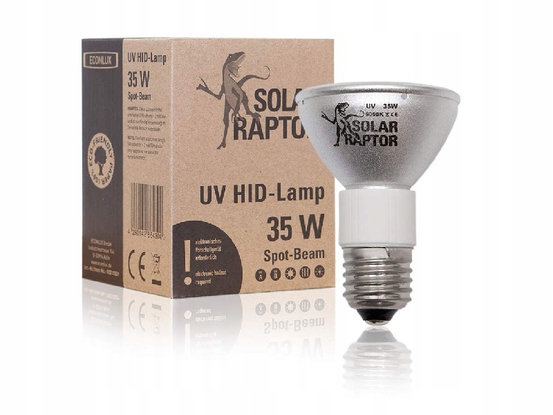 Лампа Solar Raptor HID — это мощная доза мощности, которая помогает обеспечить оптимальные условия в террариуме. В области УФ-стабильности, срока службы и интенсивности дневного света лампа Solar Raptor HID не имеет себе равных. Качество изготовления также заслуживает похвалы.