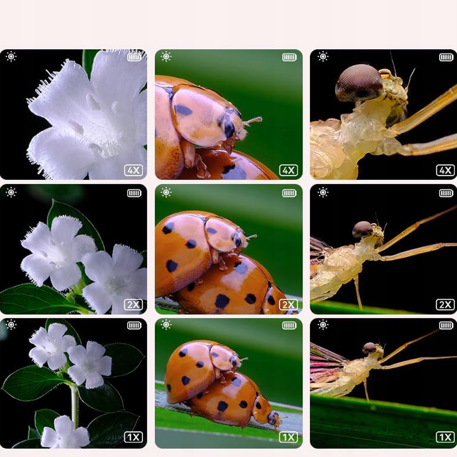 Доступны цифровые изображения с высоким разрешением 1080P, что позволяет наблюдать яркие микроскопические изображения в реальное время. С его помощью можно наблюдать за божьими коровками, пчелами, жилками растений, замысловатыми узорами на монетах, волокнах ткани и т. д.