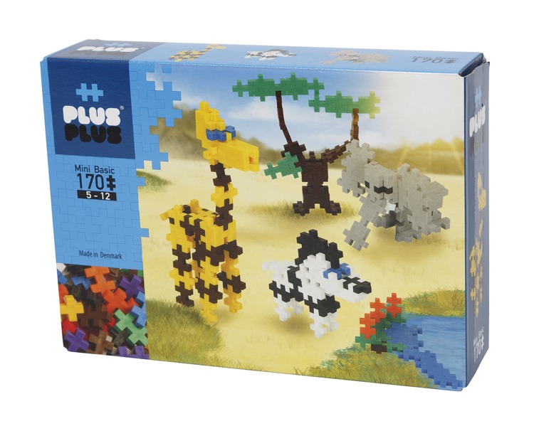 В наборе 170 кубиков Мини (20 мм) базовых цветов. В набор входит буклет о том, как сделать элементы, входящие в упаковку блоков: жирафа, слона, зебру и растения. Блоки датской компании Plus-Plus развивают детское воображение. Они характеризуются высокой точностью.