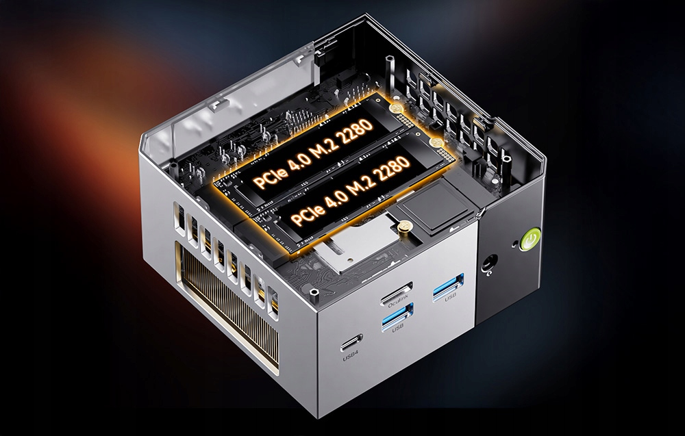 Два слота PCIe4.0 M.2 NVMe (Non-Volatile Memory Express, протокол для SSD-накопителей, гарантирующий молниеносное чтение и запись с минимальными задержками) в стандарте 2280 позволяют устанавливать SSD-носители (Solid State Drive, твердотельный накопитель, обеспечивающий быстрое чтение и запись данных) с общая емкость до 1 ТБ, а скорость передачи в несколько тысяч мегабайт в секунду сокращает время загрузки приложений до минимума. Поддержка PCIe3.0 и 4.0 (Peripheral Component Interconnect Express, стандарт шины расширения, соединяющий материнскую плату с ключевыми компонентами, такими как видеокарты или сетевые контроллеры) гарантирует совместимость с широким спектром накопителей, а благодаря разъему OCuLink (Optical-Copper Link, позволяет эффективно расширить линию PCIe за пределы корпуса компьютера с помощью медных или оптоволоконных кабелей) со скоростью 64 Гбит/с можно подключить внешнюю видеокарту, превратив EVO-X1 в мобильную рабочую станцию.