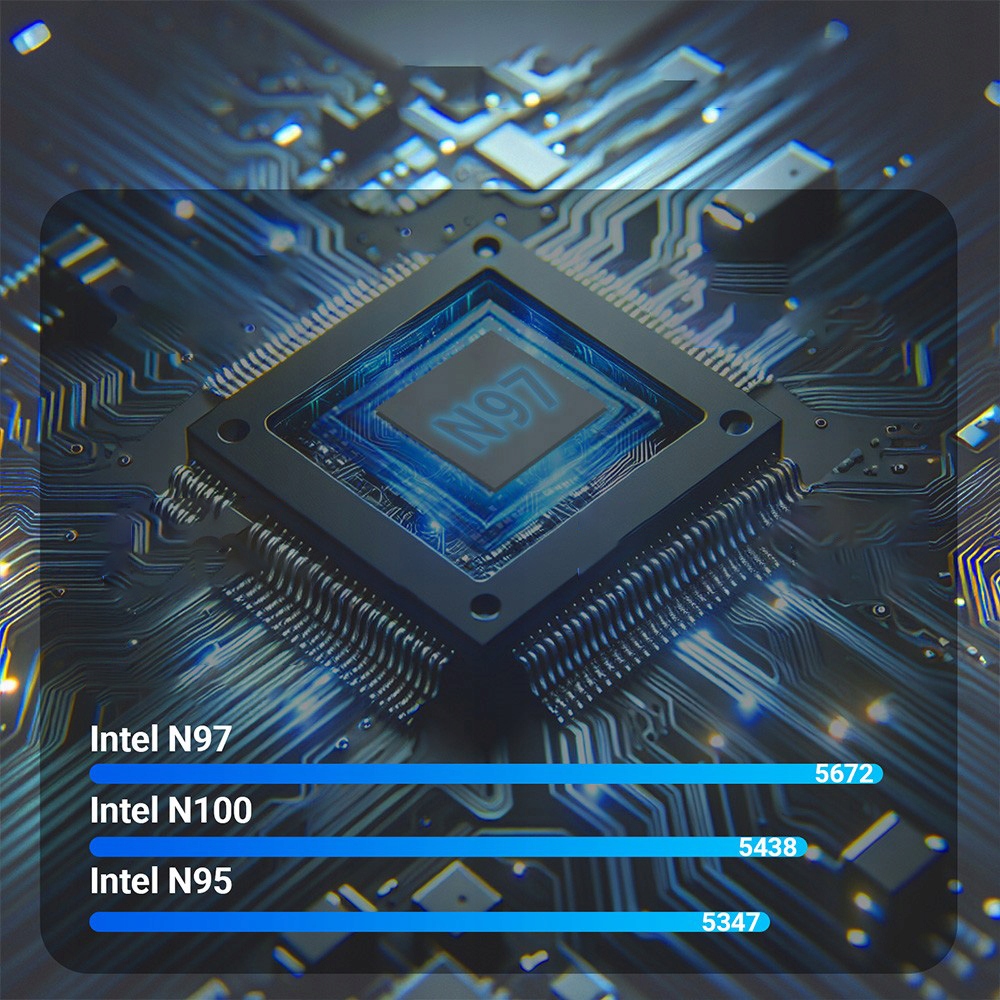 - ЦП: Кэш-память процессора Intel® N97 (6 МБ), вверх до 3,6 ГГц)