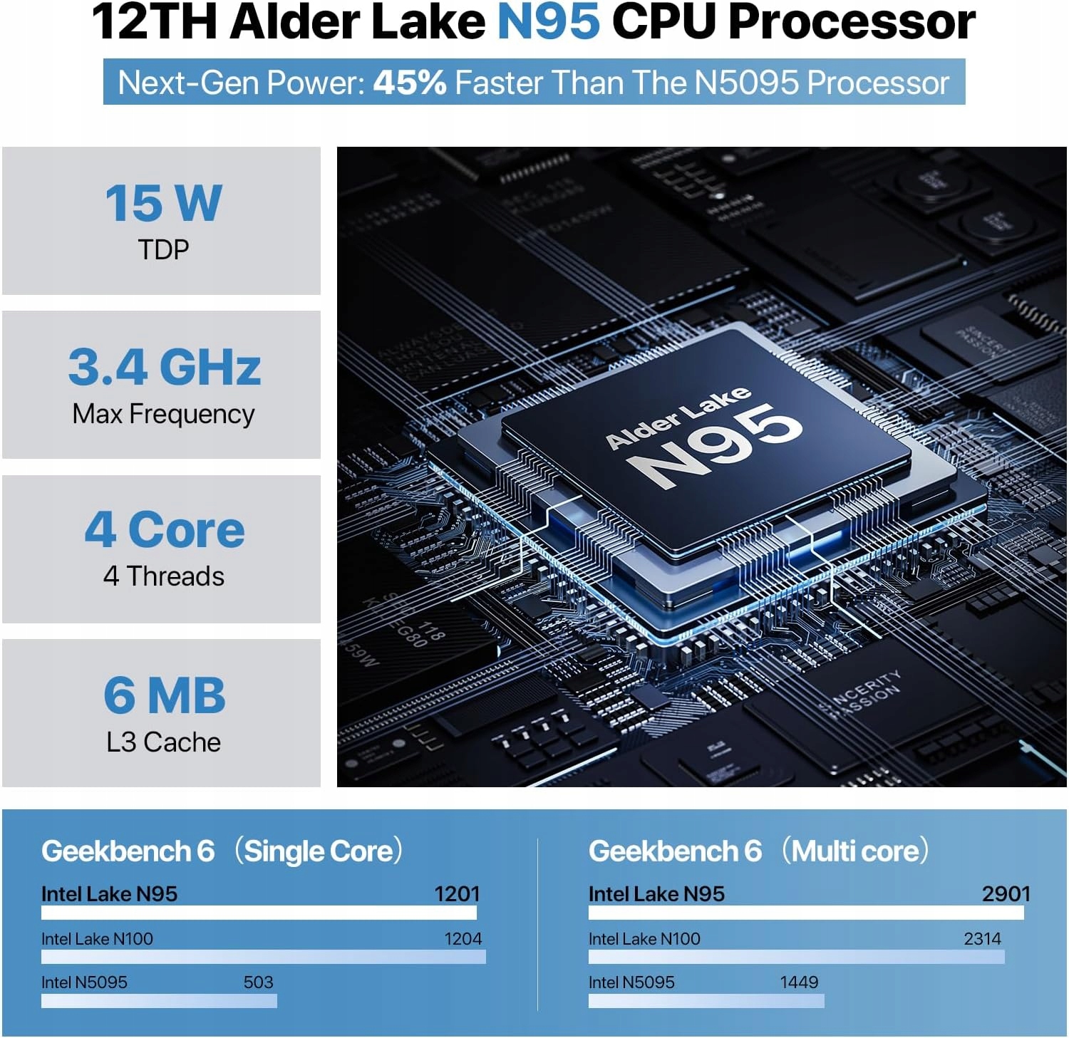 - 【Производительный мини-ПК Intel Alder Lake-N95 12-го поколения — PELADN WI-6 изготовлен на базе процессора Intel Alder Lake-N95 12-го поколения (4C/4T, кэш 6 МБ, до 3,4 ГГц, TDP 6 Вт) 2023 года и обеспечивает более чем на 25 % более высокую производительность, чем Н5105/Н5095. Компактный размер делает мини-ПК лучшим выбором для легкой офисной работы, воспроизведения видео 4K, онлайн-обучения, дизайна и т. д.