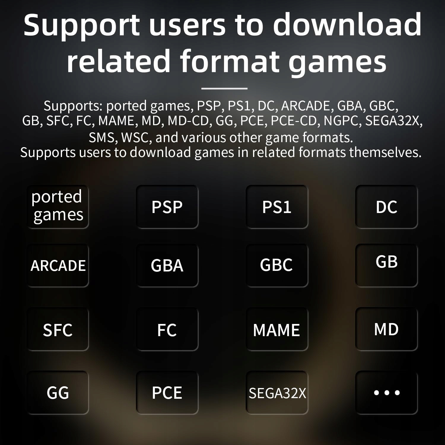 Игры: Поддержка: портированные игры, PSP, PS1, DC, ARCADE, GBA, GBC, GB, SFC, FC, MAME, MD, MD-CD, GG, PCE, PCE-CD, NGPC, sega32x, SMS, WSC и другие форматы игр. Помогите пользователям загружать игры в соответствующих форматах.
