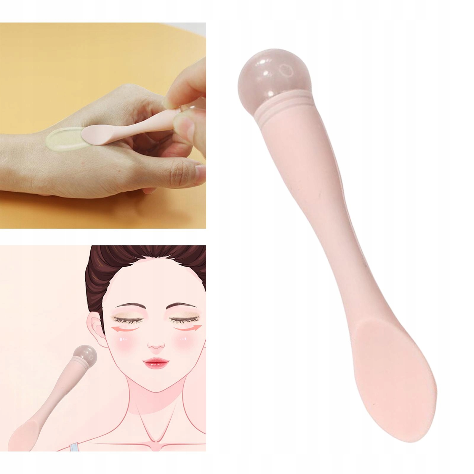 Описание: Материал: мягкая силиконовая ручка Мягкая и близкая к коже, ее нелегко сломать, легко чистить и легко наносить, чистая и гигиеничная. Дизайн: Уникальный дизайн, с двумя разными концами. Один конец — ложка для крема, а другой — ложка для крема. Другое - массажная палочка для крема для глаз, мини-дизайн, портативная, компактная и простая в использовании. Функция: массируйте кожу вокруг глаз, чтобы крем для глаз лучше впитывался, укрепляйте кожу вокруг глаз, уменьшайте отек лица и расслабляйте мышцы. Широко используется: это может быть не только массажер для глаз, но и металлическая ложка для маски, ложка для распределения крема по коже и палочка для ввоза косметики. Способ применения: 2 раза в день утром и вечером наносите соответствующее количество крема, крема для глаз, маску для лица, лосьон и т. д. наносите на лицо и область вокруг глаз два раза в день ЛАПОЙ, аккуратно массируйте, а затем слегка похлопывайте кончиками пальцев, чтобы ускорить впитывание продукта