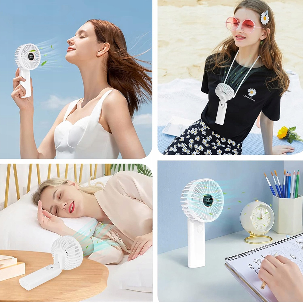 Перезаряжаемый аккумулятор портативного вентилятора широко используется и прост в использовании. Когда вы откроете портативный вентилятор на 180°, вы сможете использовать его как портативный вентилятор. В сложенном состоянии на 90° его можно использовать в качестве настольного USB-вентилятора в офисе и спальне. После того, как ремешок прикреплен, его также можно использовать в качестве веера на шее. Когда вы перестанете им пользоваться, карманный вентилятор можно полностью сложить и положить в сумку.