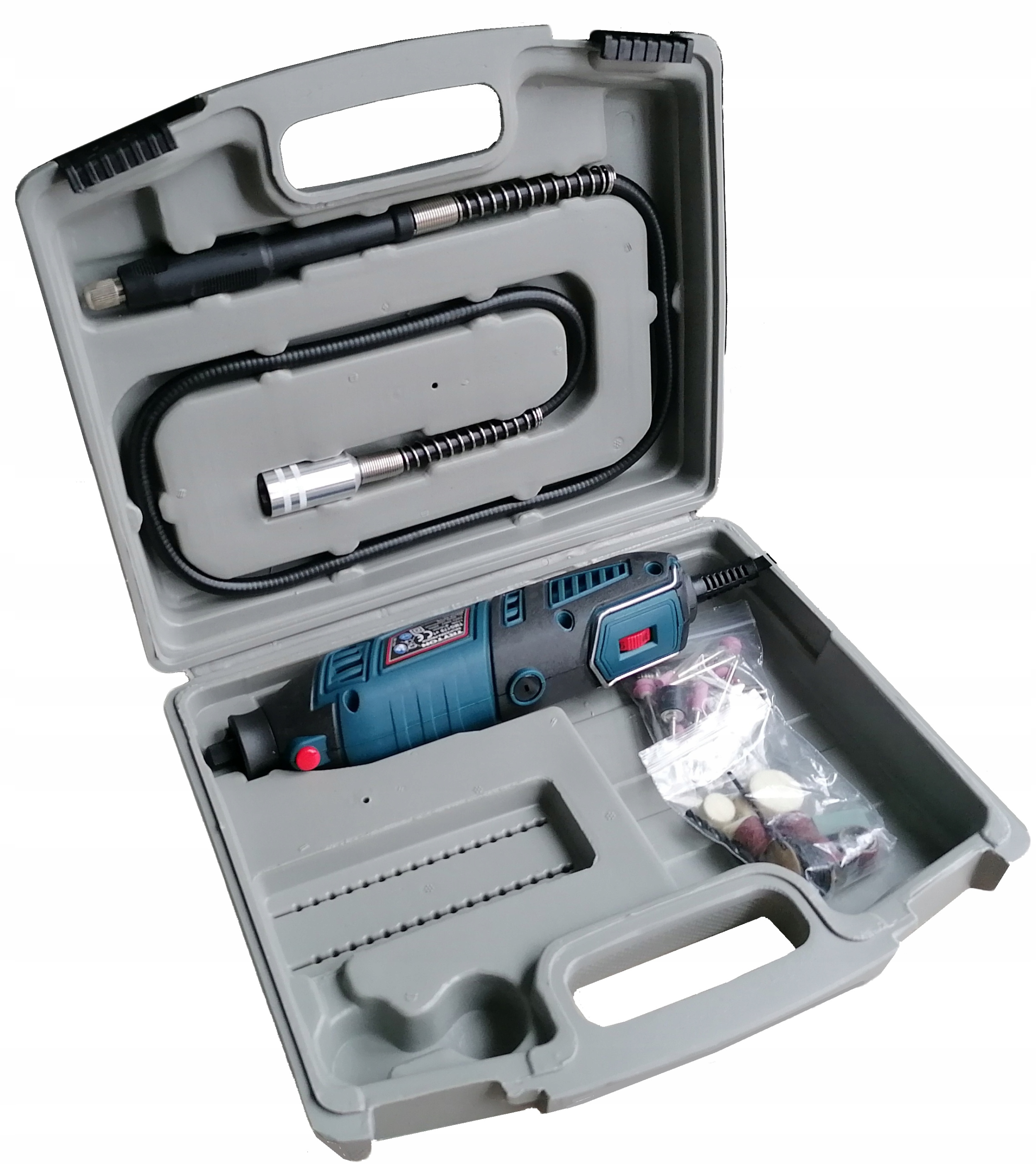 Фурнитура 40 шт: втулки зажимные; шлифовальный хвостовик 13мм; шлифовальные ленты 13 мм; сверла 2,3/3,2 мм; монтажный штифт; отрезные диски; наждачная бумага; штифт для крепления фетровых полировальных дисков; фетровые полировальные круги 22 и 13 мм; алмазные резцы; шлифовальные камни из оксида алюминия; точильный камень; гильзовый ключ, ключ L