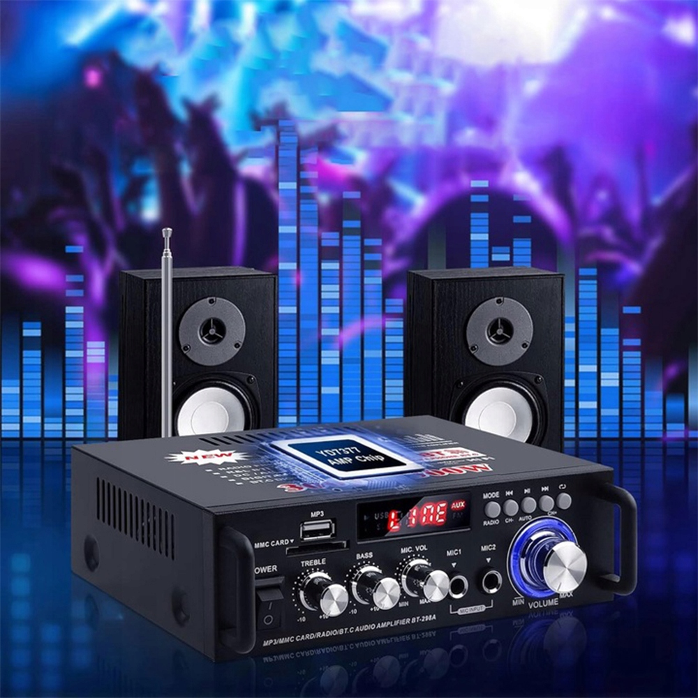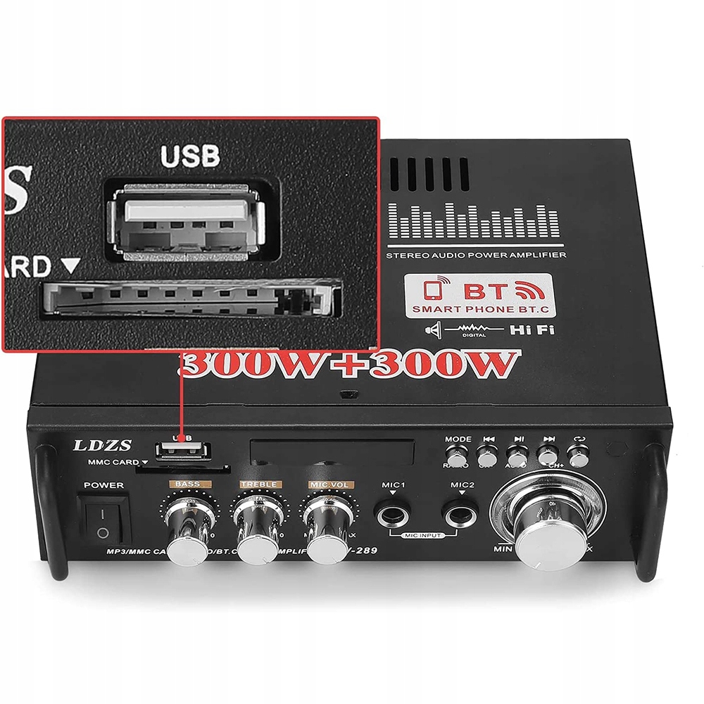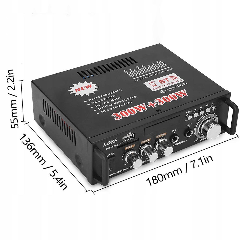 - Этот двухканальный стереоусилитель обеспечивает выходную мощность 300 Вт + 300 Вт (максимальная выходная мощность музыки 600 Вт), отличное качество звука, чистое и деликатное качество звука.