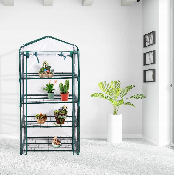 4 широких полки делают теплицу очень просторной. Теплицы можно легко сложить для хранения. Каркас теплицы изготовлен из стальных труб с порошковым покрытием и покрыт пленкой ПВХ с дверцей на молнии. Теплица очень проста в сборке.