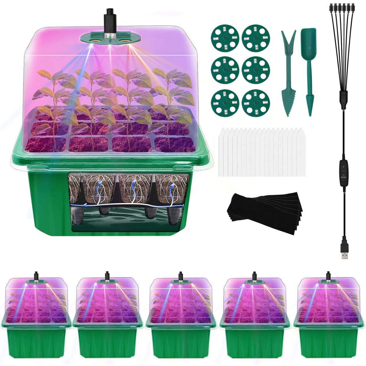 Комплексное устройство для размножения растений включает в себя: - 6 лотков для семян (12 ячеек на лоток), 6 влагозащитных куполов, 6 водонепроницаемых поддонов, 6 опорных лотков, 6 капиллярных матов, 6 ламп для выращивания растений (разъем типа C), 1 интеллектуальную систему управления (2-метровый кабель USB-C, от 1 до 6), 20 пластиковых растений Бирки, 2 инструмента для растений. Идеально подходит для посева семян, проращивания семян, размножения рассады, посадки суккулентов или любого другого типа размножения клонами растений.