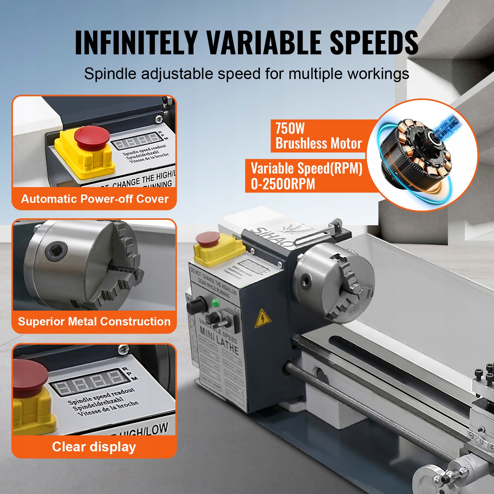 Мини-токарный станок по металлу, 750 Вт, 180x350 мм, 0-2500 об/мин, переменная скорость