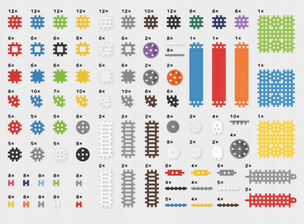 Различные формы элементов специального назначения и их большое количество позволяют создавать трехмерные формы транспортных средств, зданий и персонажей согласно инструкции, входящей в набор.