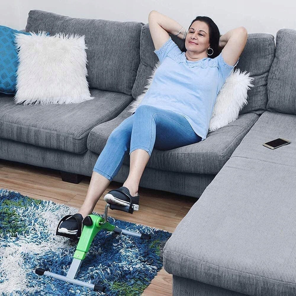 Положите его на стол, чтобы тренировать руки, или на пол, чтобы кататься на велосипеде, не вставая со стула.