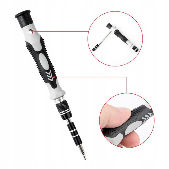 Удобная ручка со специальной насадкой форма позволяет простую и стабильную сборку и использование одной из точных бит.
