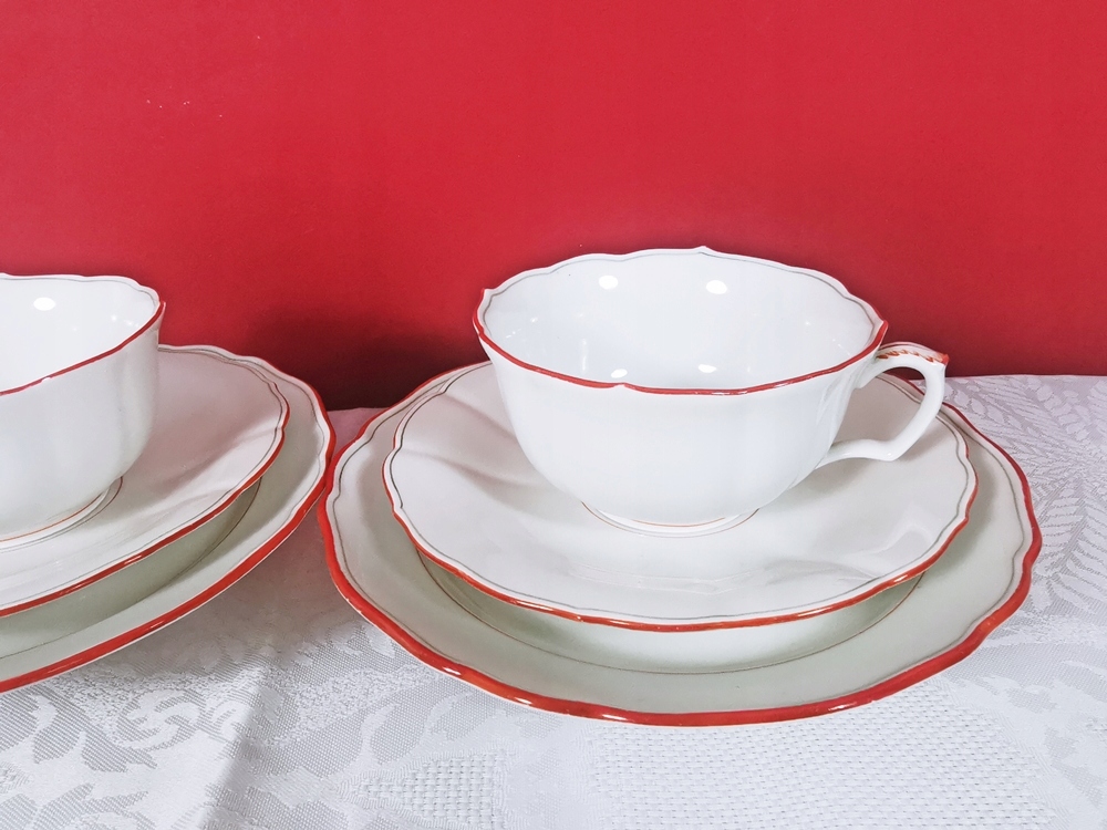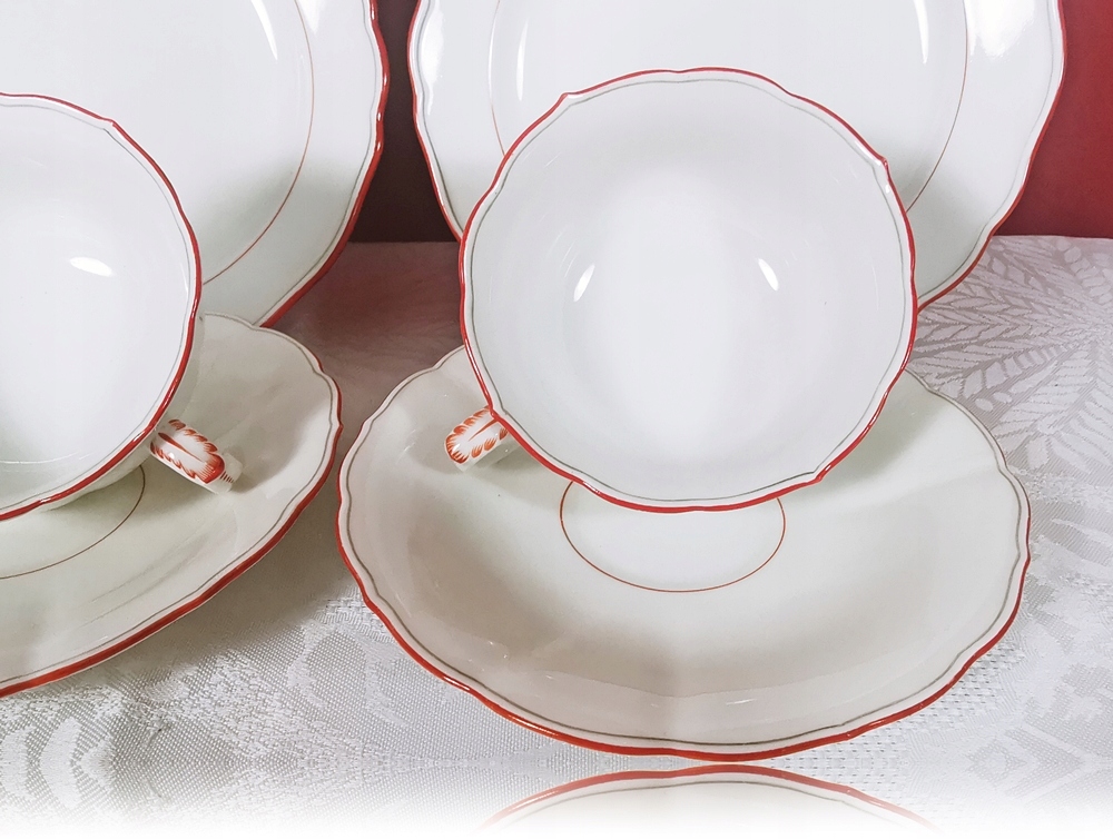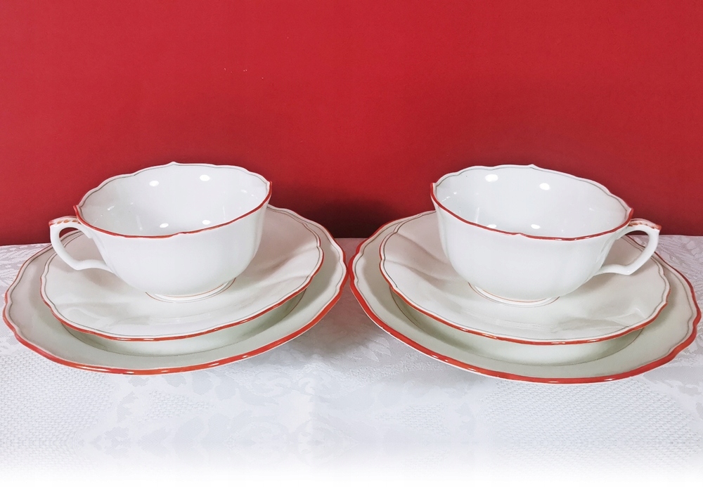 Старинный фарфор XIX века, края украшены коралловым ободком, с изящным декором на ручках.