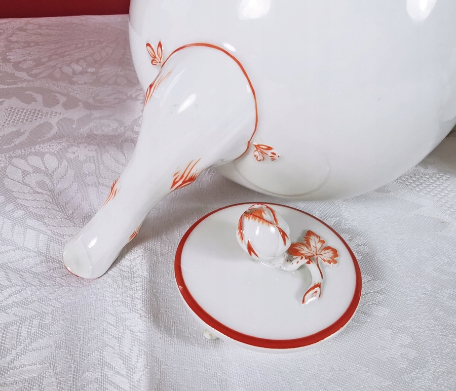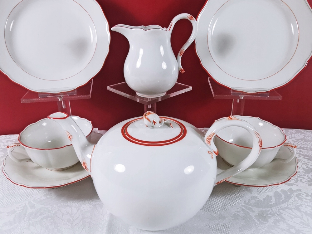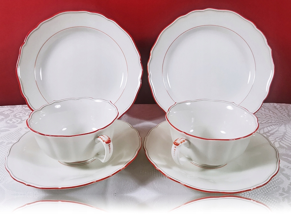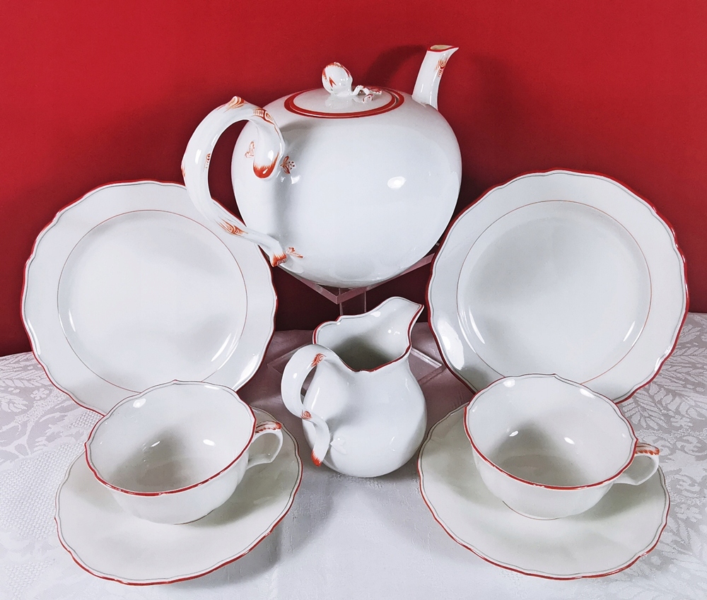 Старинный фарфор XIX века, края украшены коралловым ободком с изящным декором на ручки.