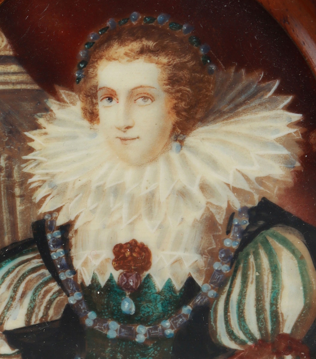 Миниатюра, изображающаяпортрет аристократки в платье с большим воротом.