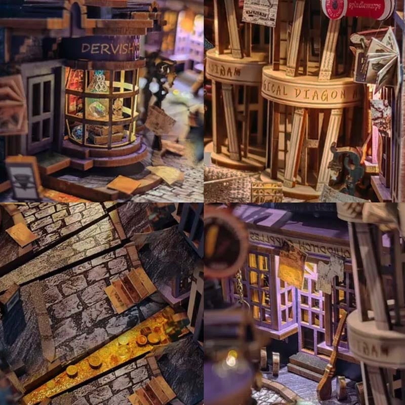 Книга Укл для любителей фэнтези, деликатное теплое внутреннее освещение, идеально смесившиеся с помощью SCI -fi книг на полке. Окрашенные элементы, размещенные на досках -Складывание дома состоит в том, чтобы помещать деревянные элементы в отверстия структуры дома, в соответствии с этапами, указанными в инструкциях