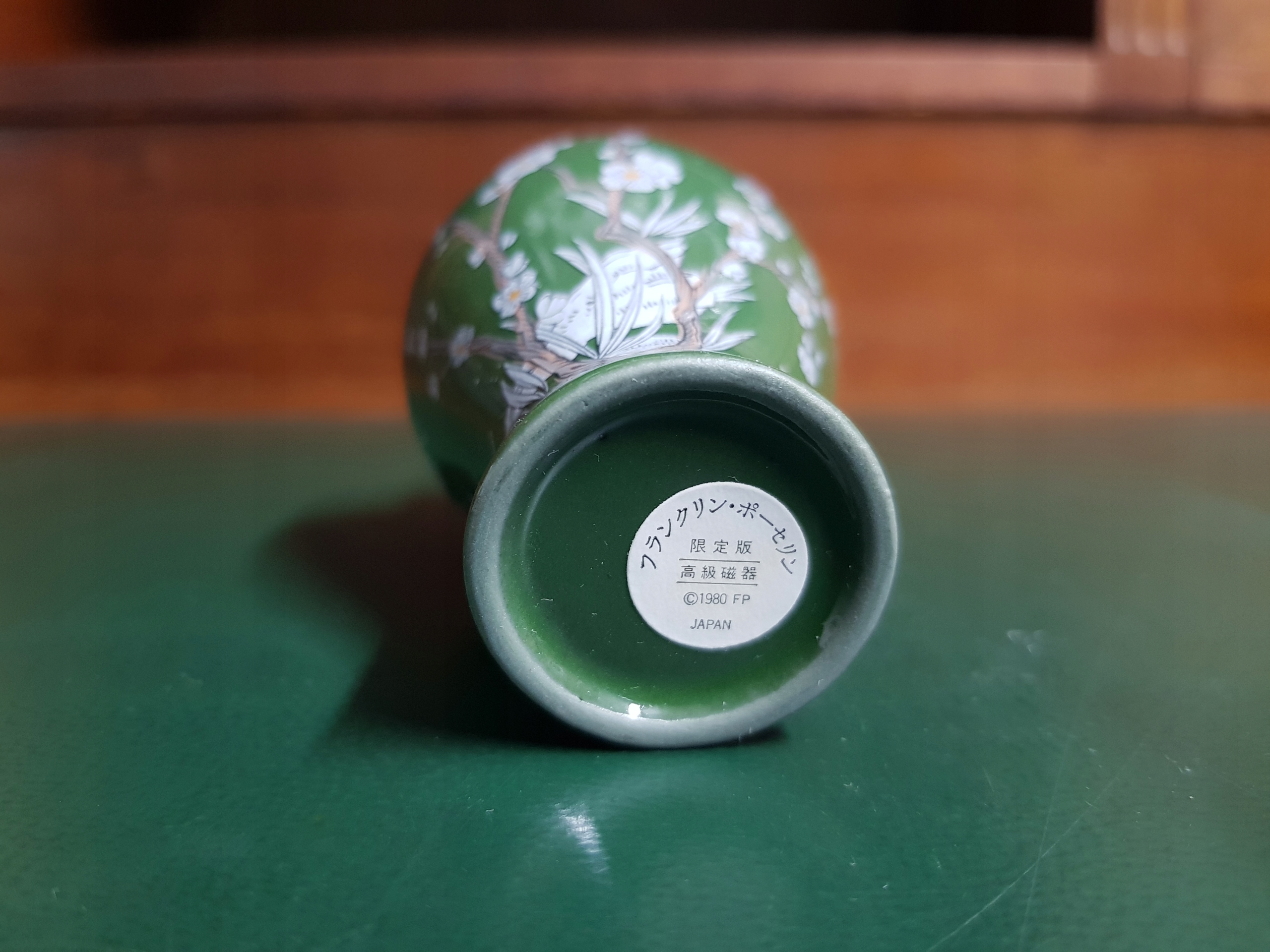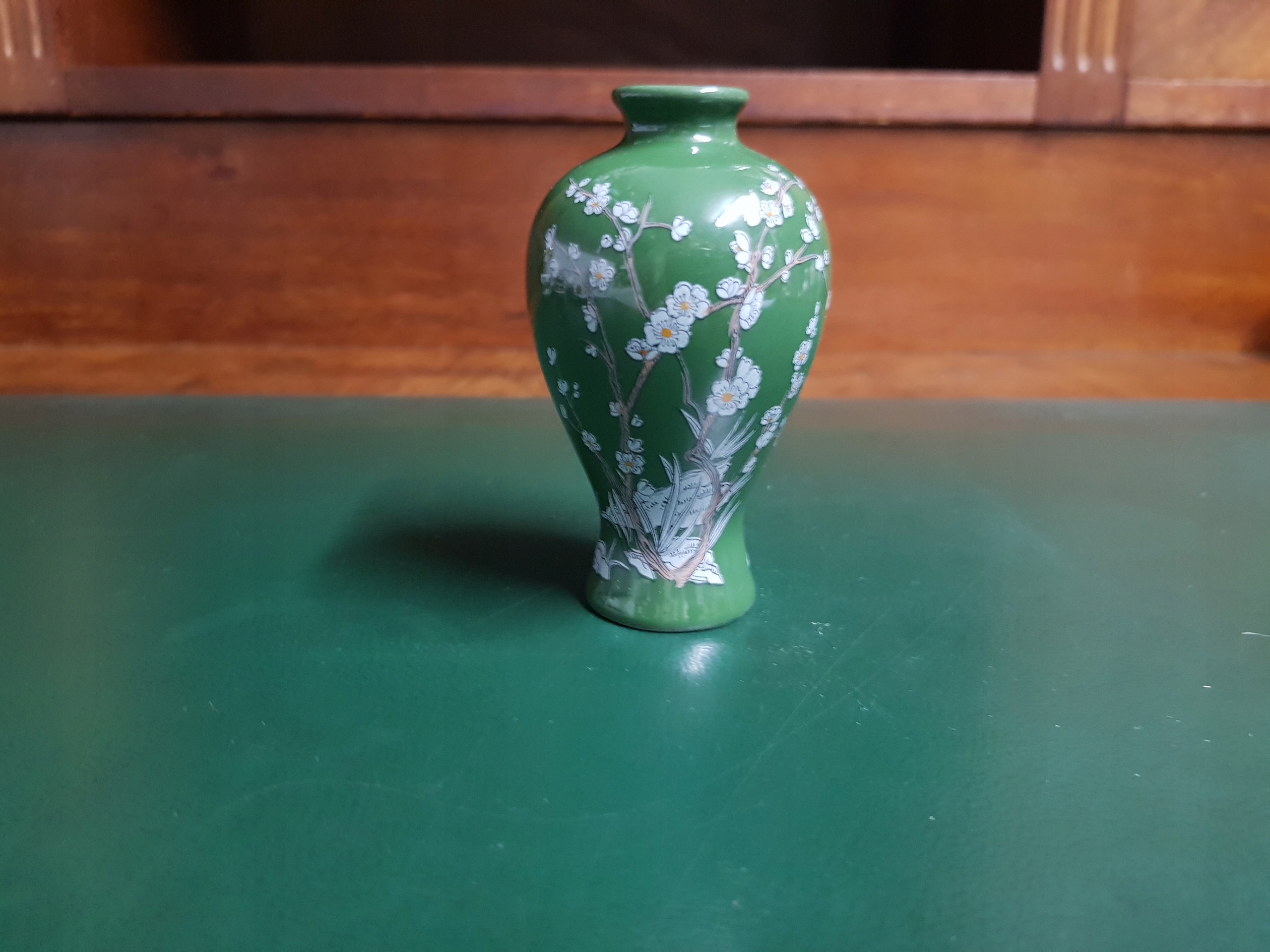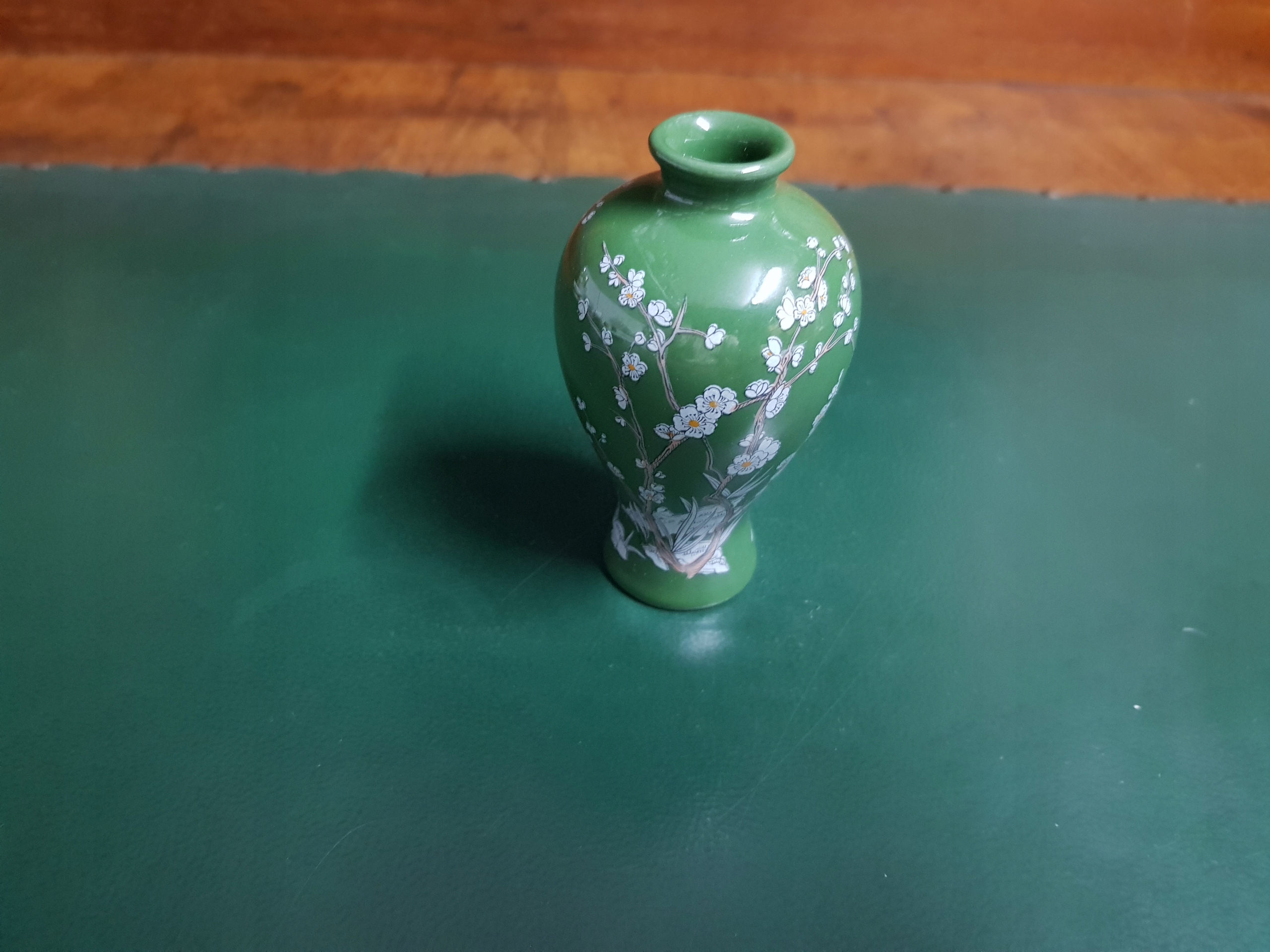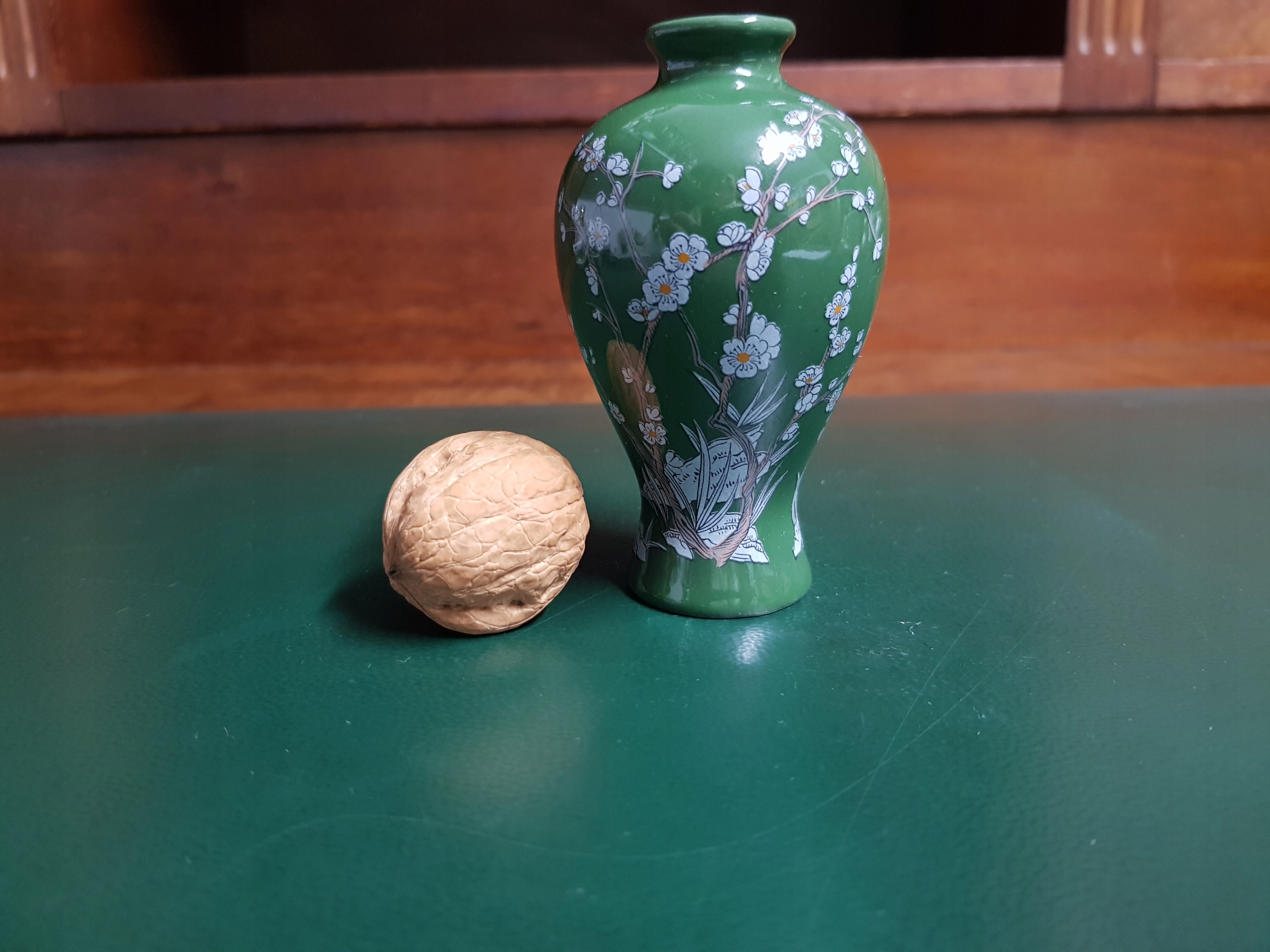 Предмет аукциона — миниатюрная коллекционная ваза с изображением растительных мотивов на зеленом фоне из коллекции Императорской Японии.