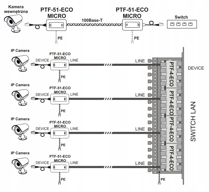 ptf-51-eco/poe/micro-это миниатюрная остановка всплеска, посвященная 100-бас-локальной сети, на основе категорий UTP 5 или 6. Небольшие размеры и встроенная труба с заглушкой обеспечивают быструю и легкую установку и скрывают устройство в небольших корпусах. Он идеально подходит для защиты IP -промышленных камер, оснащенных оригинальными фондами, скрывающими аксессуары и все соединения. Ограничитель защищает от воздействия перенапряжений и атмосферного дисплея, а также от актов вандализма (операция оглушенного пистолета). Он может быть использован для защиты локальной сети внутри зданий, защиты конечных устройств и переключателей или радиомостов. Устройство индивидуально защищает каждую пару передачи, где всплеск устранена выше 6 В внутри них.