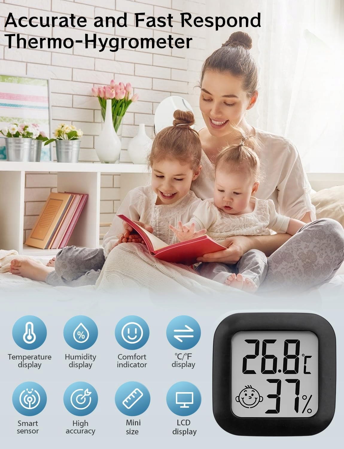 Миниатюрный термогигрометр с интеллектуальным и точным датчиком, который информирует о температуре и влажности окружающей среды. Быстрая реакция и высокая точность.