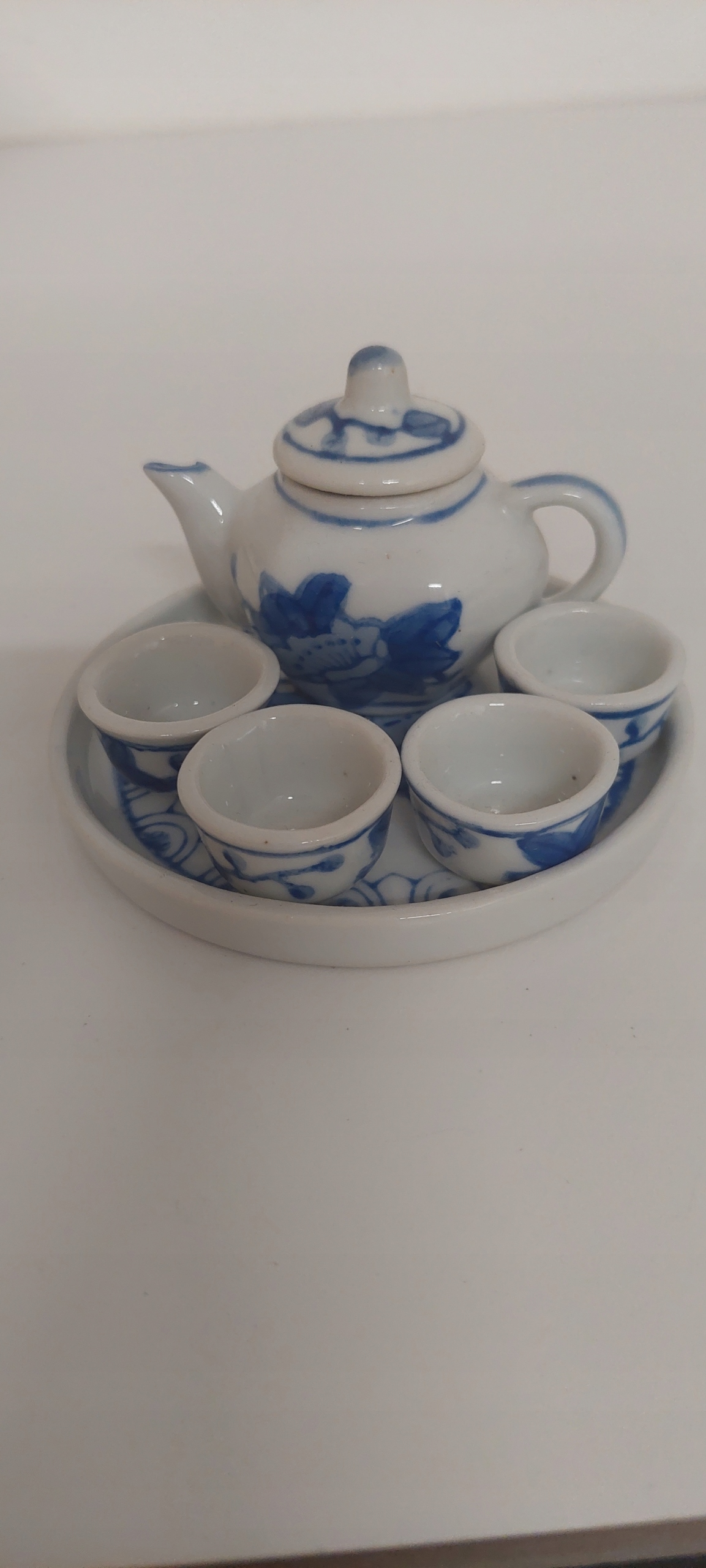 Фарфоровая кукла, в очень хорошем состоянии с диаметром 9 см, высота чайника 5 см.