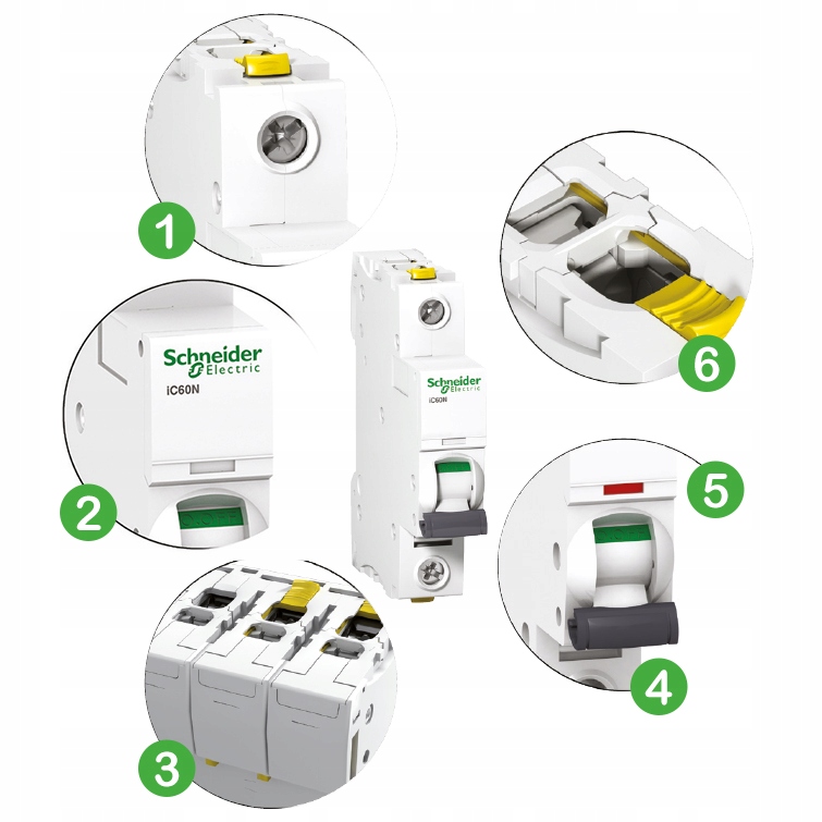 - Видимая зеленая полоса гарантирует физическое размыкание контактов и позволяет выполнять операции в нисходящей цепи. в полной безопасности ul> <р>5. Окно индикатора триггера. Отключение из-за помех обозначается красным индикатором на передней панели <р>6. Двойные клеммы для подключения сверху или снизу: кабель или штыревая рейка