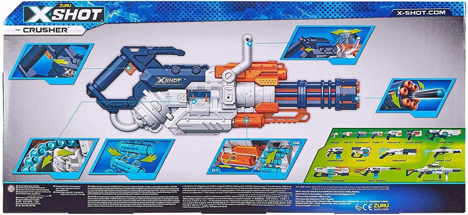 Crusher — это удобная пусковая установка большой мощности. У нас тут огромный. При выстреле ствол вращается и дротики извлекаются из цепного магазина. Магазин очень прост в установке, поэтому загрузка боеприпасов не замедлит вас в бою. Просто поднимите крышку, вставьте полный магазин, закройте патронник и снова в бой. Благодаря этой пусковой установке мы можем вести одиночный или непрерывный огонь. В режиме непрерывного огня мы можем очень быстро опустошить весь магазин. Пусковая установка также имеет дальность действия до 27 метров. Crusher также имеет удобную рукоятку перезарядки, благодаря которой стрельба доставляет массу удовольствия.