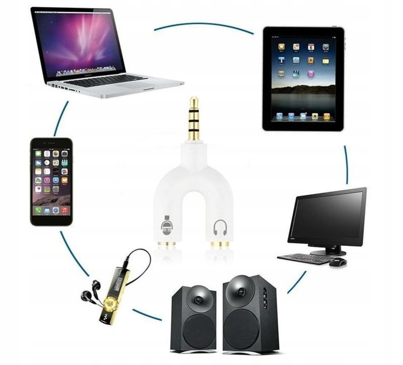 Адаптер высокого качества, который позволяет отделить сигнал от ноутбука, компьютера, консоли и других устройств с интегрированным аудиозметичным сокетом (микрофон и наушники в одном порту) для двух отдельных сокетов. Благодаря этому он позволяет подключать наушники или динамики и микрофон отдельно к одному мини -джак -розетку 3,5 мм, например, в ноутбуке. Соперники были помечены с изображениями