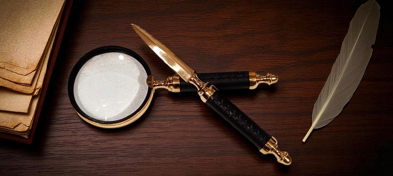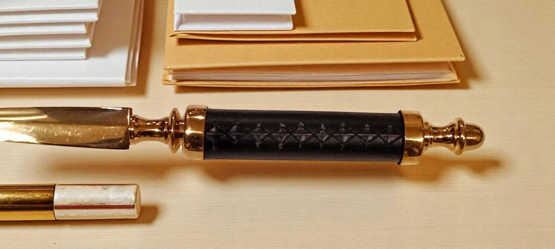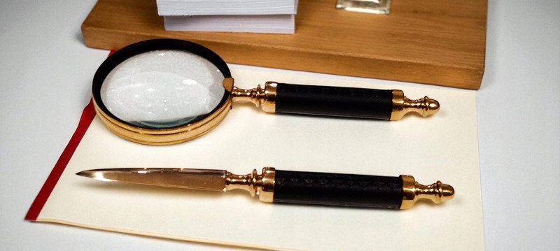 Стильная, элегантная лупа и нож для вскрытия корреспонденции, выполненные из золотистого металла, украшенные декоративной ручкой.