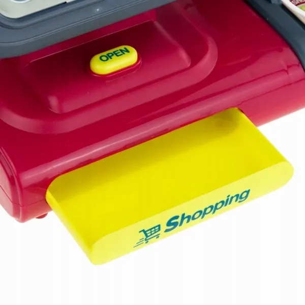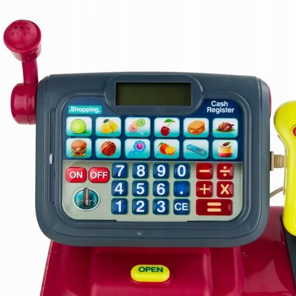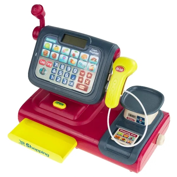 Кассовый аппарат размерами 28x16x24см, работающий от 2 батареек АА, обеспечиваетчасы работы обучающее развлечение.