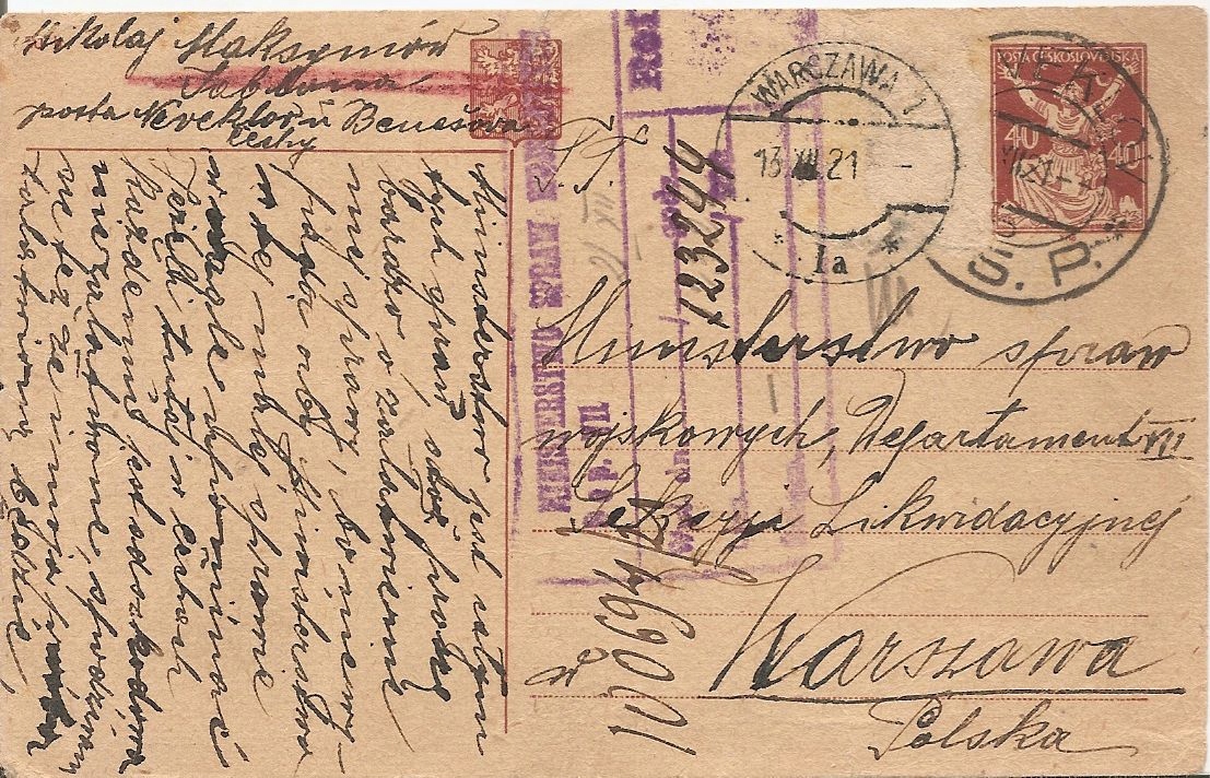 MINISTERSTWO SPRAW WOJSKOWYCH -karta -stempel 1921 rok -ZAOLZIE