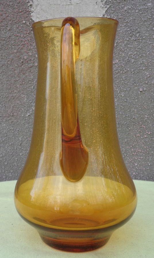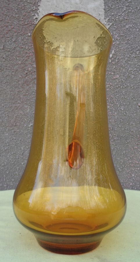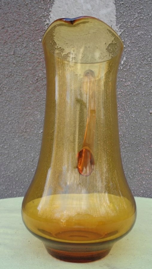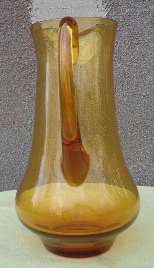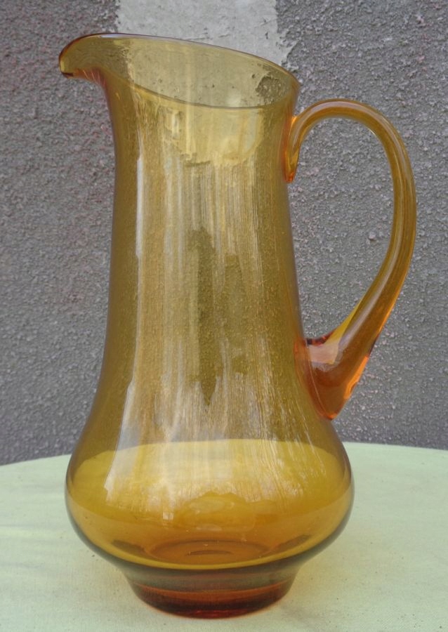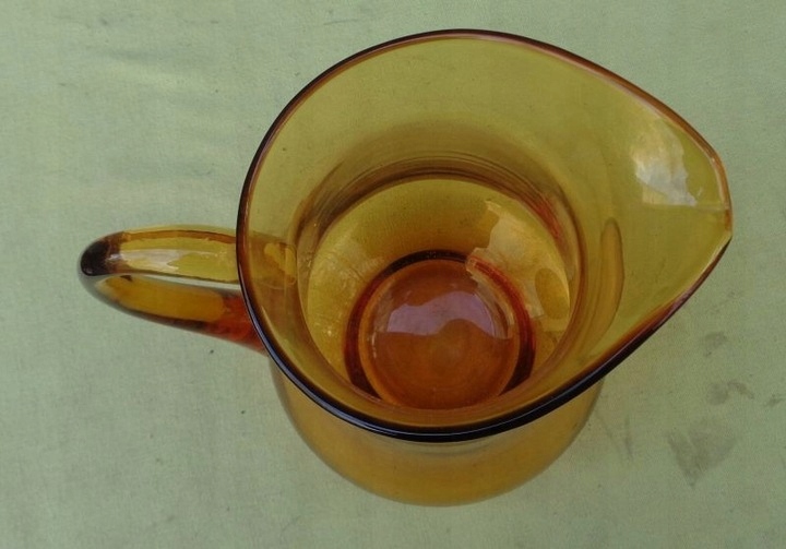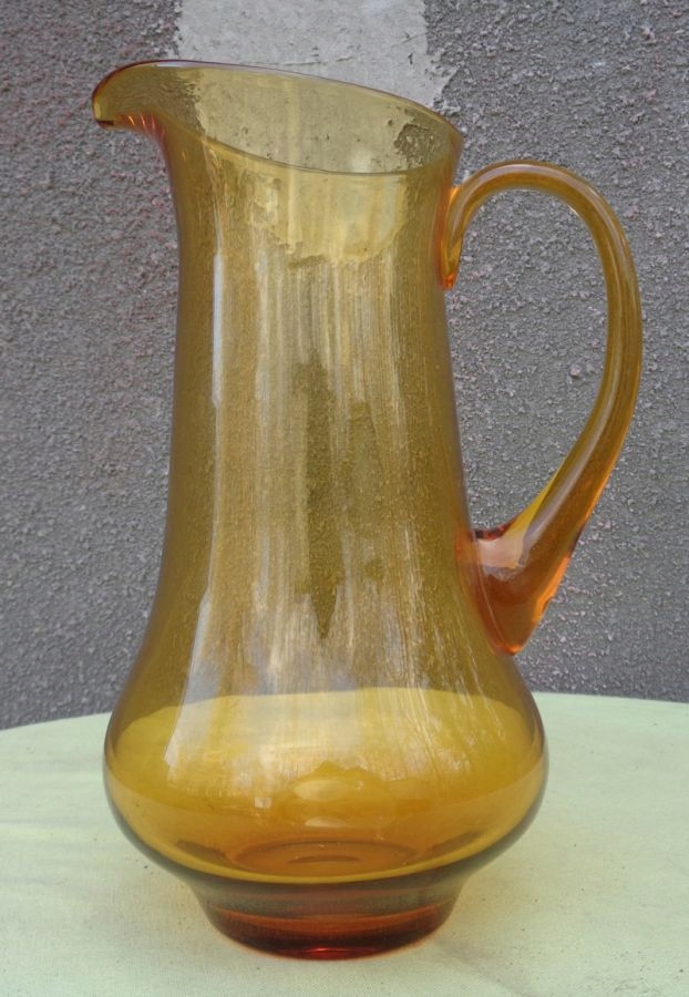 Интересный, интересный стеклянный кувшин для воды 1960-х годов. Экспонат имеет элегантную, классическую форму и очертания. Нижняя часть экспоната расширена и сужается к верху. Кувшин имеет ручку интересного профиля. Стекло имеет медовый цвет. Нижняя часть экспоната плоская. Экспонат не поврежден. Имеются небольшие царапины, возникшие в результате использования. Всем рекомендую.