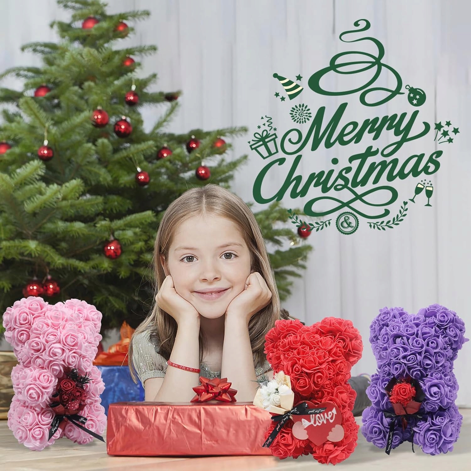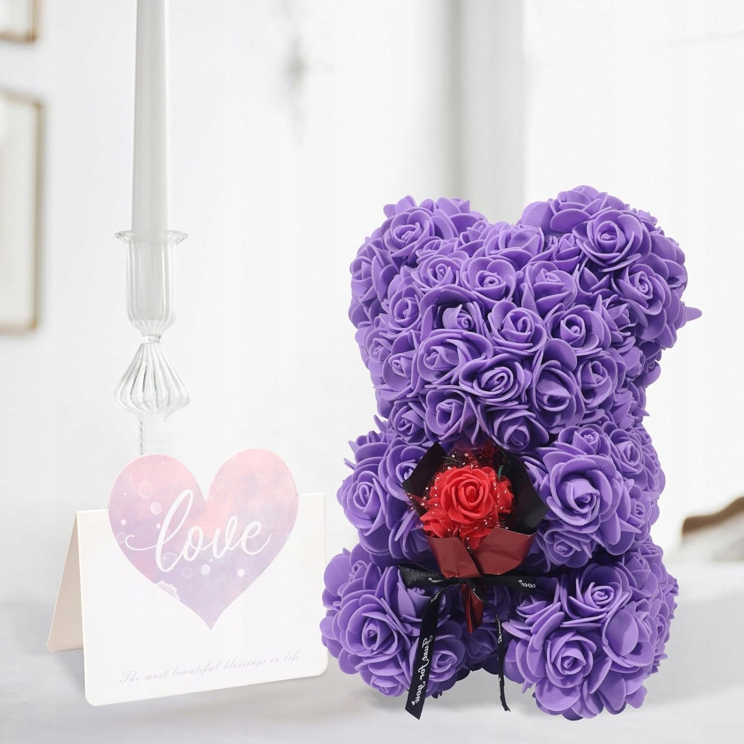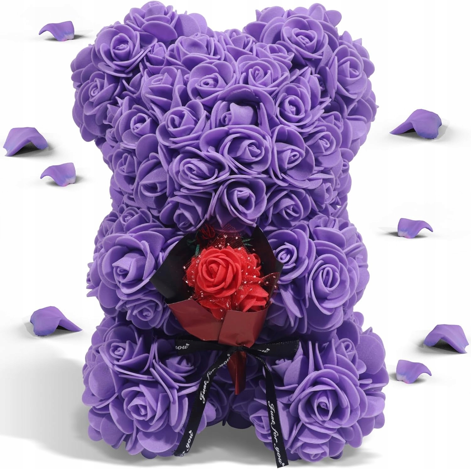 MIS из роз, розовый медведь в фиолетовой коробке 25 см + серебряное ожерелье