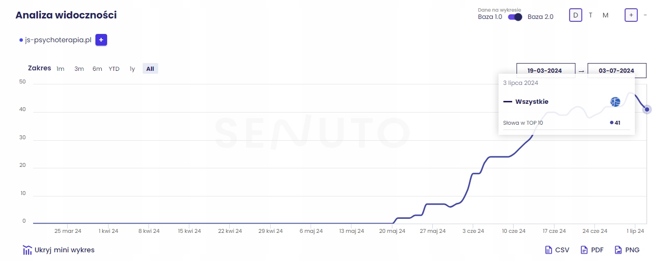 Ниже приведен пример другого клиента, , который мы позиционируем в PLN 100 net в месяц , анализ диаграммы Senuto с течением времени с течением времени: